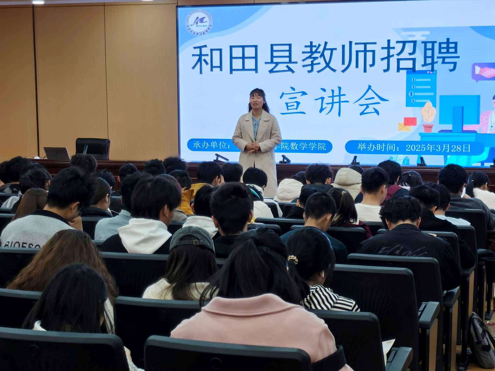 为响应国家教育援疆号召,助力边疆教育高质量发展,3月28日,数学学院联合和田县教育局在第二学术报告厅举办和田县教师专场招聘会,搭建毕业生与西部教育需求精准对接的桥梁。本次招聘会面向初高中教育领域,提供语文、数学、英语等9个学科共计300余个就业岗位,由和田县教育局相关负责人何艳艳、项莹蘋主讲,吸引全校百余名学生参加。