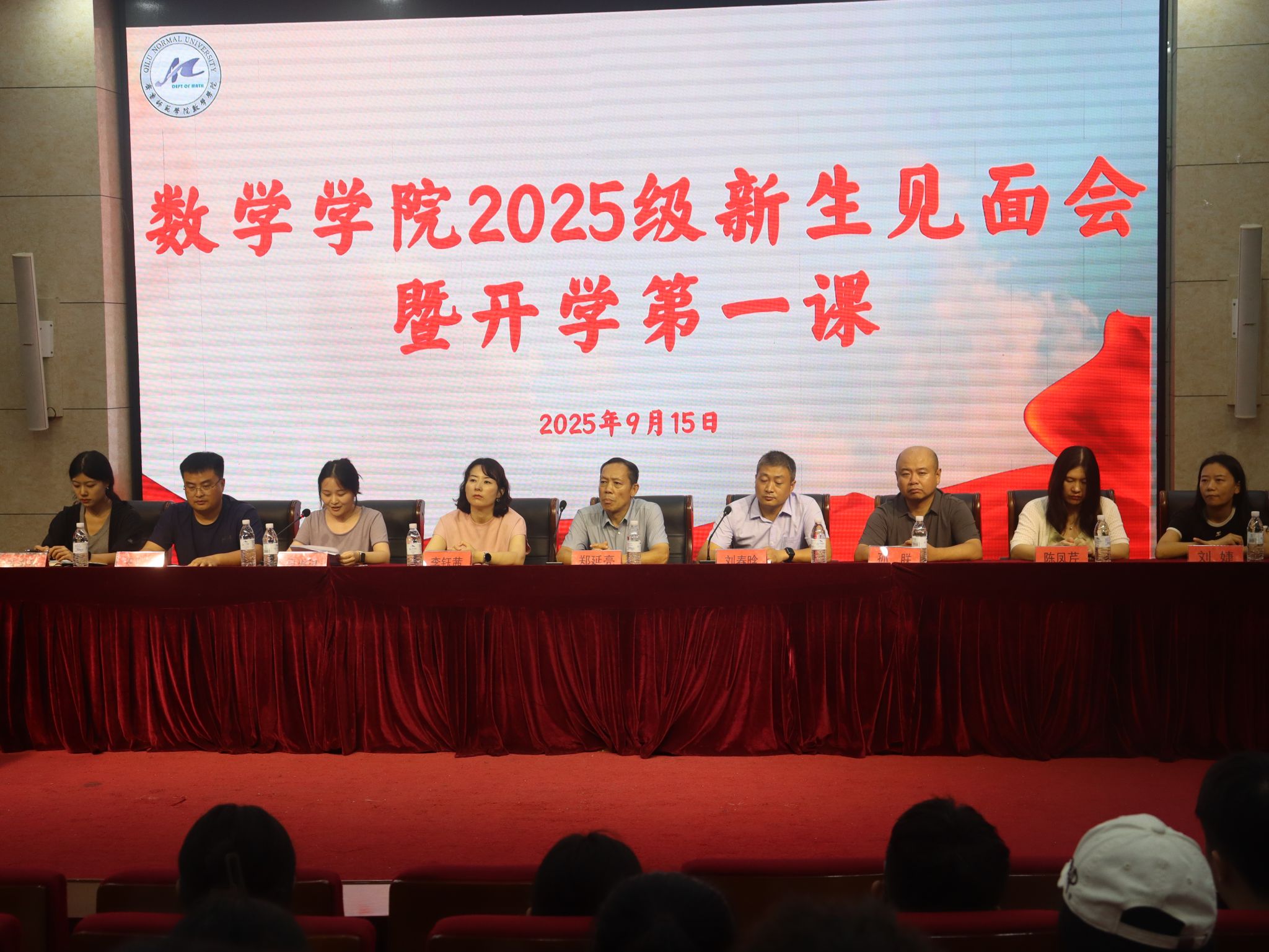 为帮助新生快速融入大学环境、深入了解学院文化,传承数学人严谨求实、追求卓越的精神,9月15日,数学学院于第一学术报告厅举行“2025级新生见面会暨开学第一课”。学院党委书记郑延亮、副院长刘春晗、党委副书记李钰茜、副院长孙朕、院长助理吴琳琳、办公室主任陈凤芹、辅导员刘婕、毛睿雅以及2025级全体新生共同参加。此次见面会由数学学院团总支书记王亚东主持。