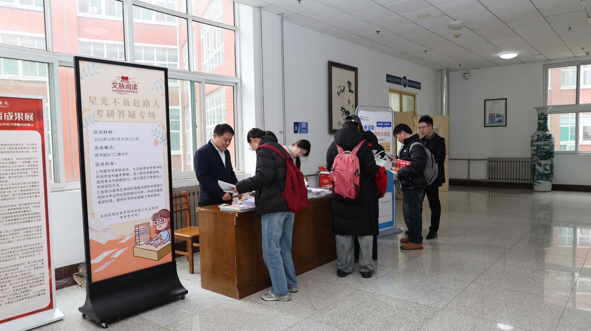为进一步助力考研学子精准把握备考方向,高效利用学术资源,全面提升复习效率与应试能力,11月7日,图书馆联合高校图书馆考研阅览室在图书馆北门二楼大厅举办“文脉阅读·星光不负赶路人”考研答疑活动。