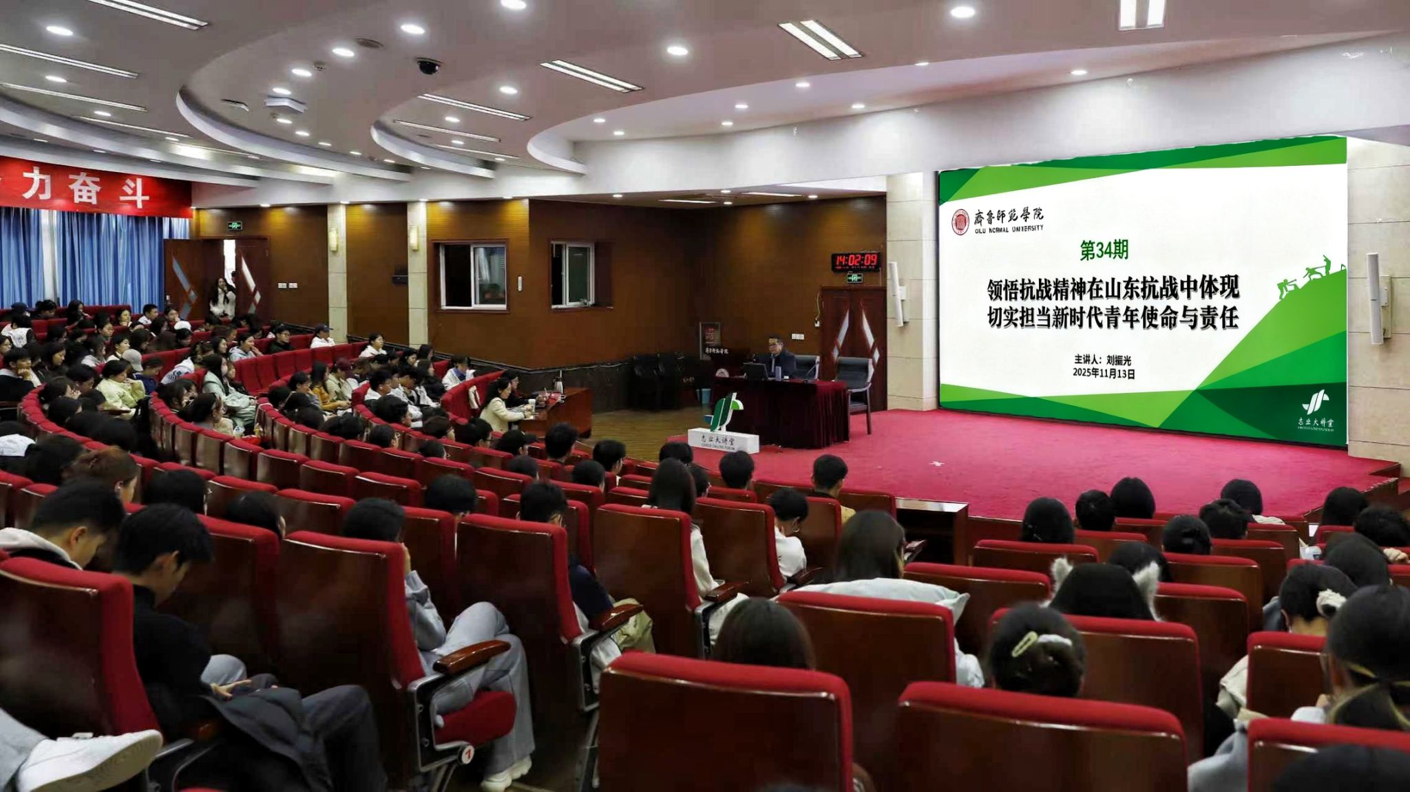 为深入贯彻落实习近平总书记在纪念中国人民抗日战争暨世界反法西斯战争胜利80周年大会上的重要讲话精神,引导广大青年学生铭记历史、缅怀先烈、珍爱和平、开创未来,11月13日,学校举行第34期志业大讲堂,邀请马克思主义学院刘振光教授作《领悟抗战精神在山东抗战中体现 切实担当新时代青年使命与责任》的专题报告。讲座由马克思主义学院党委书记郭百灵主持,全校各专业300余名学生到场聆听。
