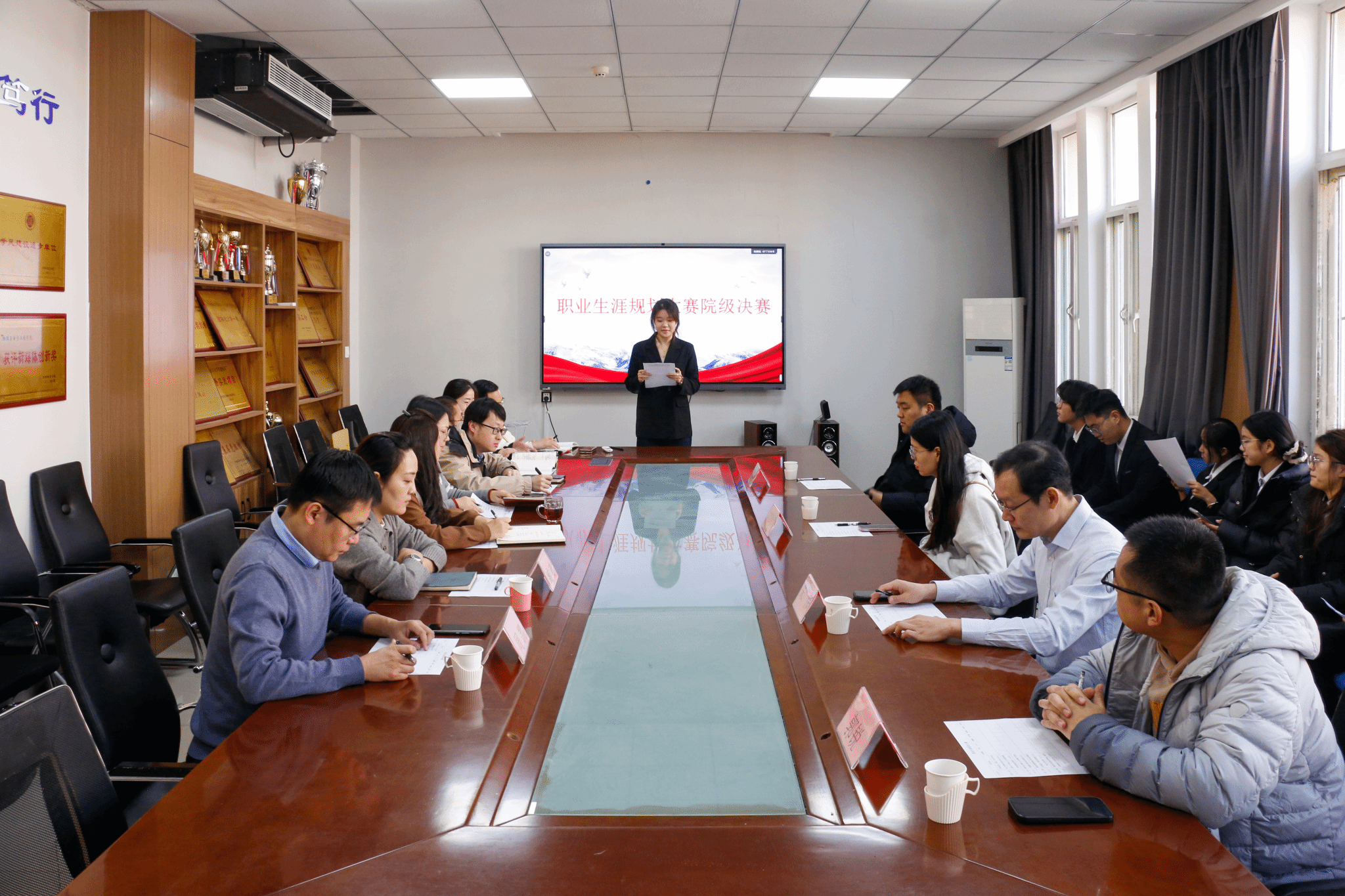 决赛现场,参赛选手以PPT演示为核心载体展开个人职业规划展示。每位选手均在规定时间内,将个人职业理想与行业发展趋势、专业特色相结合,围绕自我认知、职业环境分析、目标确立、路径规划及行动计划等关键模块有序阐述。