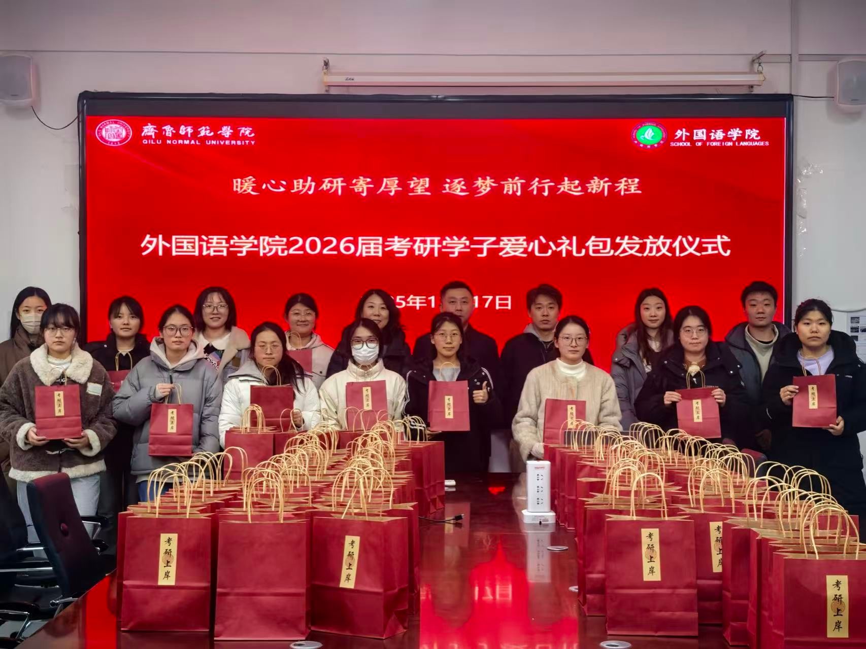 考研临近之际,为切实缓解2026届考研学子的备考压力,为逐梦路上的他们注入温暖力量,12月17日,外国语学院举行“考研爱心礼包”发放活动。一份份满载关怀的礼包、一句句情真意切的祝福,为即将奔赴考场的学子们保驾护航,助力他们以昂扬姿态冲刺理想彼岸。