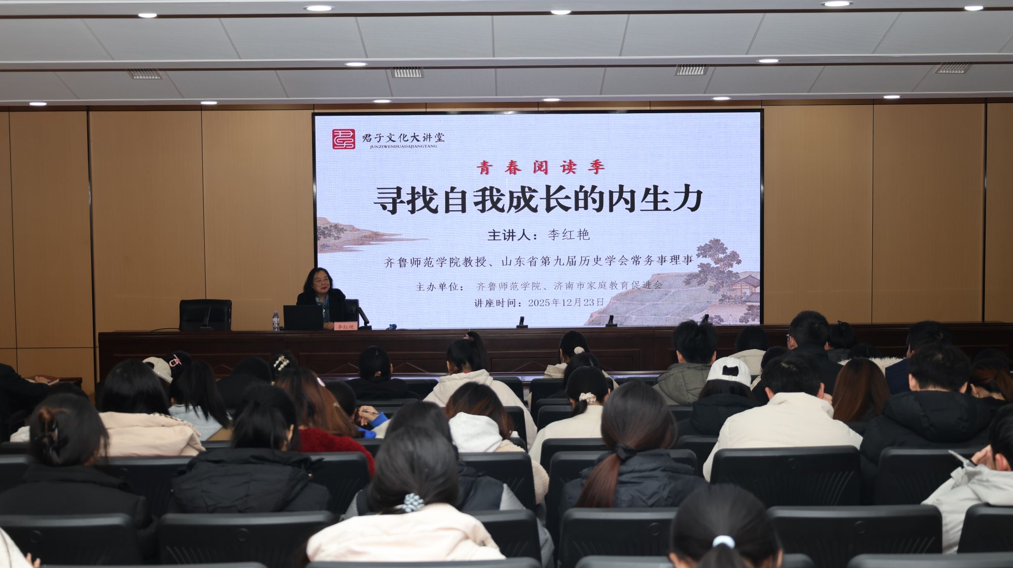 为深入学习贯彻习近平总书记关于高等教育的重要论述和深化全民阅读的重要指示要求,深化大学校园阅读,12月23日下午,学校“君子文化”大讲堂第五期报告会在章丘校区第二学术报告厅开讲。本次报告会以“青春阅读季——寻找自我成长的内生力”为主题,由学校李红艳教授主讲。