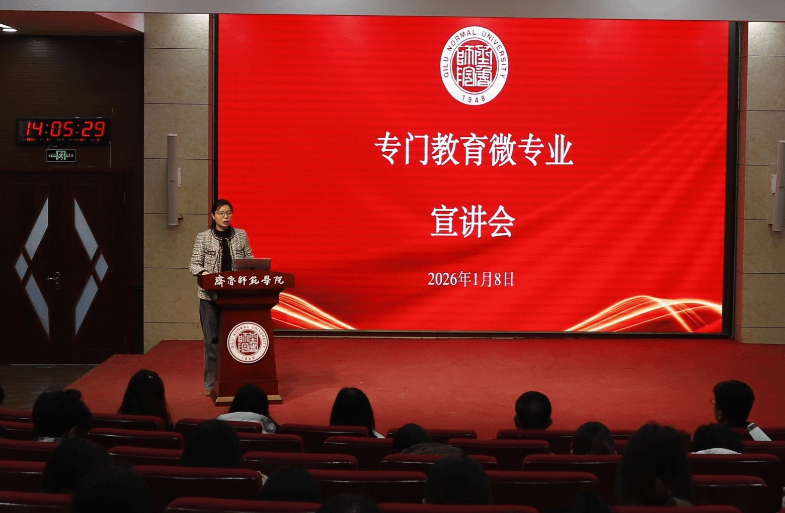 为深入贯彻落实学校微专业建设规划,推动复合型人才培养,1月8日,由教务处组织的2026年度微专业招生宣讲系列活动正式启动。首场活动联合BEAT365英国官网专门教育研究院开展,聚焦“专门教育微专业”,致力于帮助学生深入了解该微专业政策、课程设置与发展前景。宣讲活动在章丘校区第一学术报告厅举行,吸引了来自教师教育学院等7个学院的近300名学生积极参与。人事处处长、专门教育研究院副院长刘增军,人事处副处长、专门教育研究院秘书长李华,以及“专门教育”微专业负责人、教师教育学院刘桂荣教授出席活动。活动由教务处副处长田甜主持。