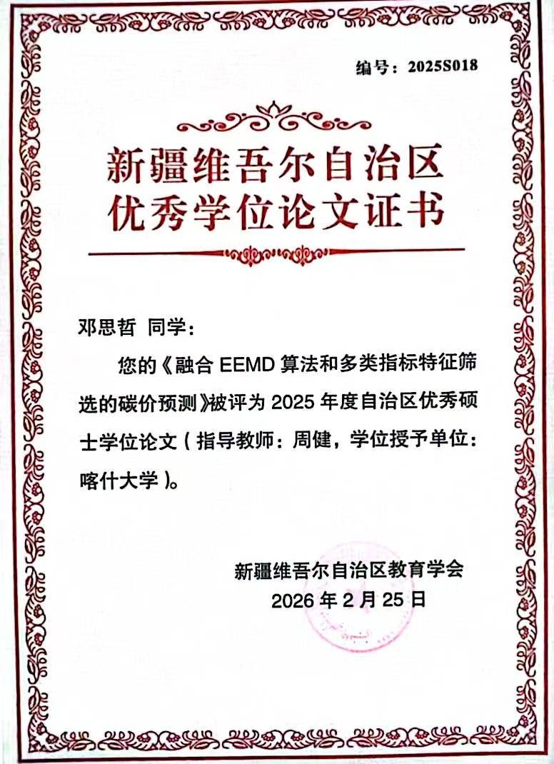 近日,2025年度新疆维吾尔自治区优秀硕士学位论文评选结果揭晓。学校经济与管理学院与喀什大学经济与管理学院联合培养研究生邓思哲的硕士论文《融合EEMD算法和多类指标特征筛选的碳价预测》获评优秀硕士学位论文,成为喀什大学本年度唯一获此殊荣的硕士论文。