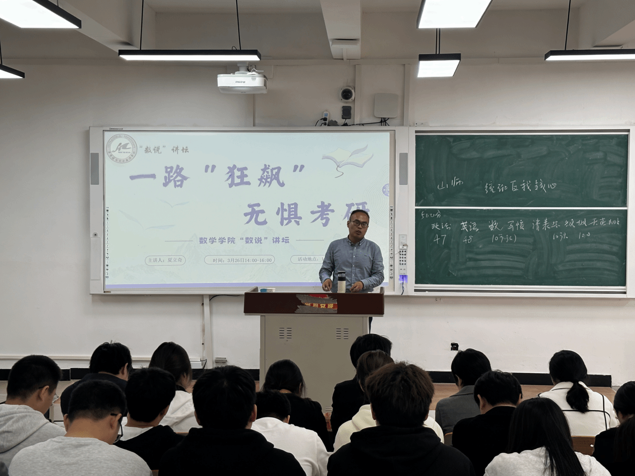 作为学院“数说”讲坛的开篇之作,本次讲坛并非单纯的考研指导,而是以考研为切入点,讲述专业成长的探索之路。夏立奇博士以“勇气与自我救赎”为核心,结合自身从零基础备考、绝地翻盘的考研经历,还原了求学路上迷茫、挫败与坚持的全过程,分享择校择专业的取舍逻辑、高效学习方法与低谷期心态调整策略的同时,更传递了面对选择的判断思路与直面困境的破局勇气,让学子直观感受数学专业学习中坚持与变通的重要意义。