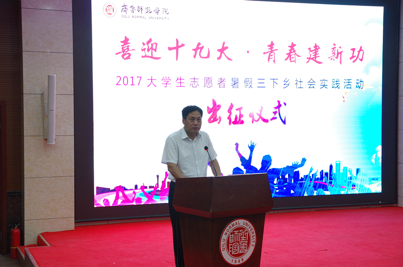 7月13日下午,BEAT365官网2017年大学生志愿者暑期“三下乡”社会实践活动出征仪式在章丘校区学术报告厅隆重举行。校党委副书记张殿臣,组织部、宣传部、教务处、学生工作处、团委负责人,各学院党团总支负责人、辅导员、社会实践指导教师及学生志愿者代表参加了出征仪式。