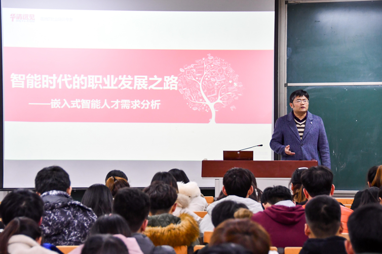李鹏在报告中强调,全面智能时代的到来,对于物电学院的同学来讲,既是挑战,又是机遇,嵌入式技术作为“软”“硬”结合的新技术,是同学们今后迎接挑战,把握机遇的核心技术。