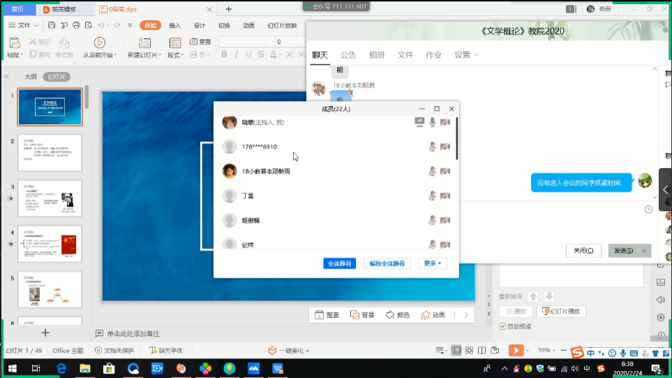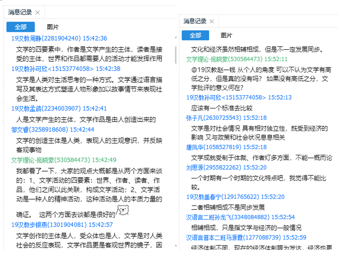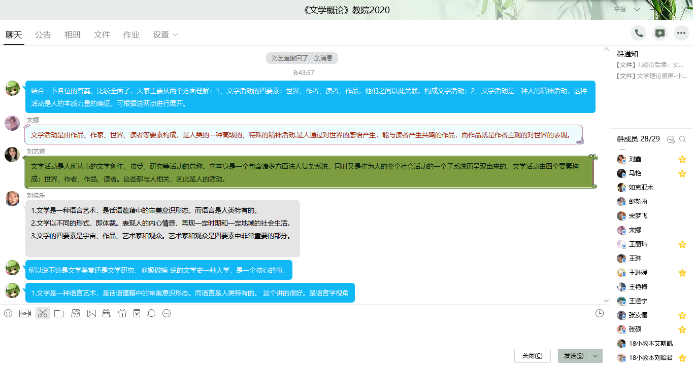 上课情况:目前,《文学理论》网络课教学已运行两周。第一周采用直播见面课的方式讲解课程基本问题。教师教育学院周一上午的课程由于智慧树平台拥堵,转为腾讯会议直播,学生全勤、回应良好。文学院周一下午课程使用智慧树平台见面课,学生全勤并使用qq群积极互动。有一位学生遇到突发问题,无法使用智慧树参与直播教学,已发送录屏视频和ppt材料帮助该生完成学习。