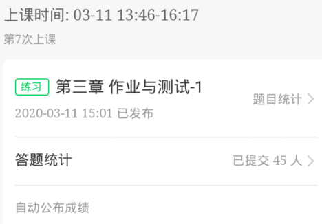 教学实施顺利,到课率97.8%(其中一人因停电无信号,不能加入课程,已单独说明情况)。随堂作业在课程结束后30分钟内提交,完成情况良好,部分同学反应答题时间紧张。