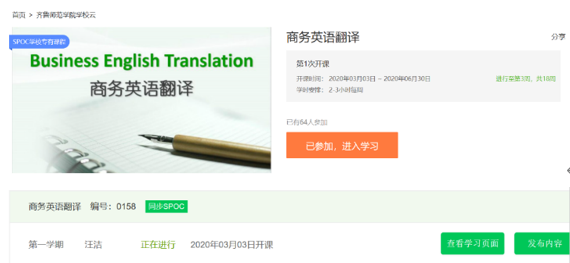 新冠肺炎疫情防控期间,为阻断疫情向校园蔓延,教育部要求2020年春季学期延期开学,并提出利用网络平台,保证“停课不停学”。这给习惯于传统教学模式的高校教师带来了重重挑战。如何充分利用各类网络教学平台,如何合理选择网络课程资源,如何科学安排在线教学流程,如何有效保证在线教学的学习效果……都成为高校教师需要思考的问题。本文以“商务英语翻译”课程为例,探索基于SPOC以学为中心的混合式在线教学。