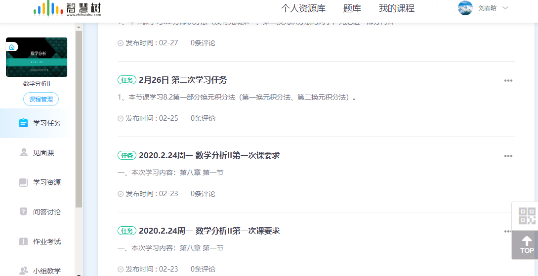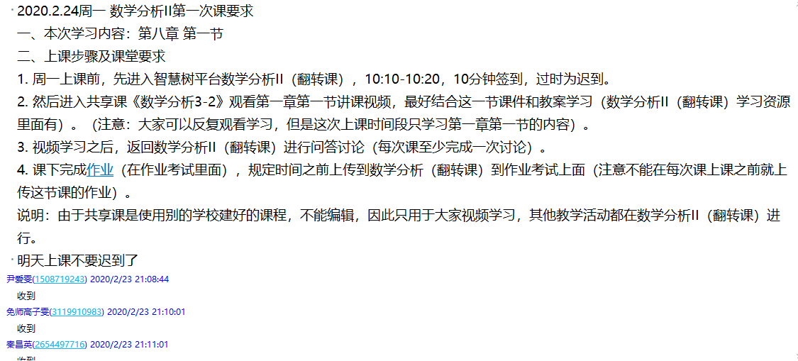 首先在上课之前在数学分析(翻转课)上发布了第一次学习任务,让学生了解课堂教学步骤、学习内容、学习要求等,并同步在QQ群进行了通知。