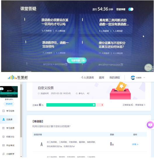 学习完本节课的内容后,进行在线答疑,同学们能够踊跃参与,提出学习中遇到的问题,老师进行解答,有的同学也参与回答问题。见面课课堂答疑功能较少,由于无法输入数学公式,无法上传图片,有些问题学生没有办法提问,致使一些学生有问题确提不出来,这时候使用了QQ群,学生可以发送问题图片进行提问,老师也发送图片进行解答。期间也发起了投票环节,检验学生的学习的效果,学生都积极参与,正确率达到85%以上。