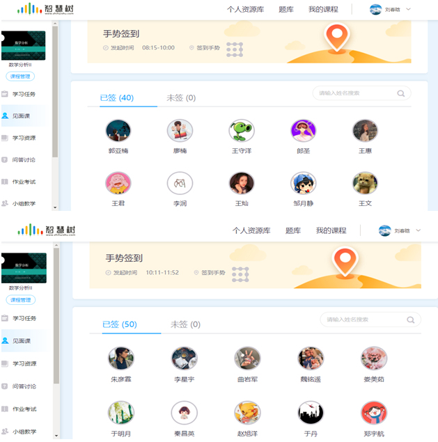 然后,课前15分钟打开数学分析II(翻转课)上见面课,开启签到功能,但由于网络卡,很多学生不能一次签到成功,经过多次,学生都能完成签到。上课期间也使用随机点名功能进行了点名。