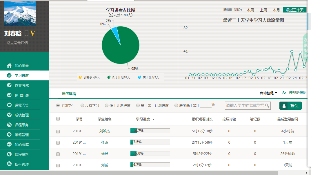 前两次教学智慧树教学平台网络非常拥堵,学生无法进行签到,有的同学刷新很多次还是无法进入,也就无法听到直播,这时让学生在QQ群里进行了签到。共享课视频观看还是比较正常的,学生能够正常视频学习,虽然可以监控学生的学习进度,并进行督促,但是学生是否只是刷视频,是否真正进行了学习没有办法进行监控。见面课课堂答疑功能较少,由于无法输入数学公式,无法上传图片,有些问题学生没有办法提问。只有老师有语音功能,学生没有语音功能,无法进行语音互动。