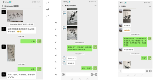 2.课下的教学互动在线上教学中也凸显了出来,尤其是在前一周的课后,学生会有很多的问题,针对学生的不同接受程度,线下会针对每个同学进行单独辅导工作,主要是以微信单独交流的方式,让学生尽快解决问题。