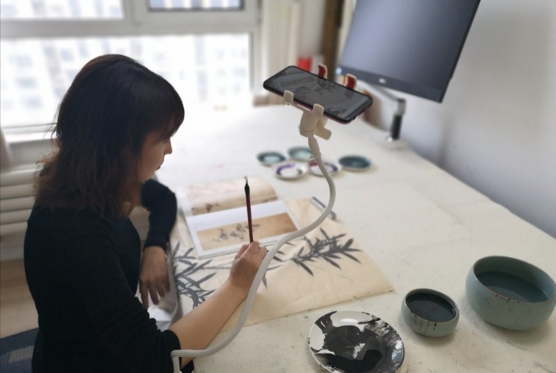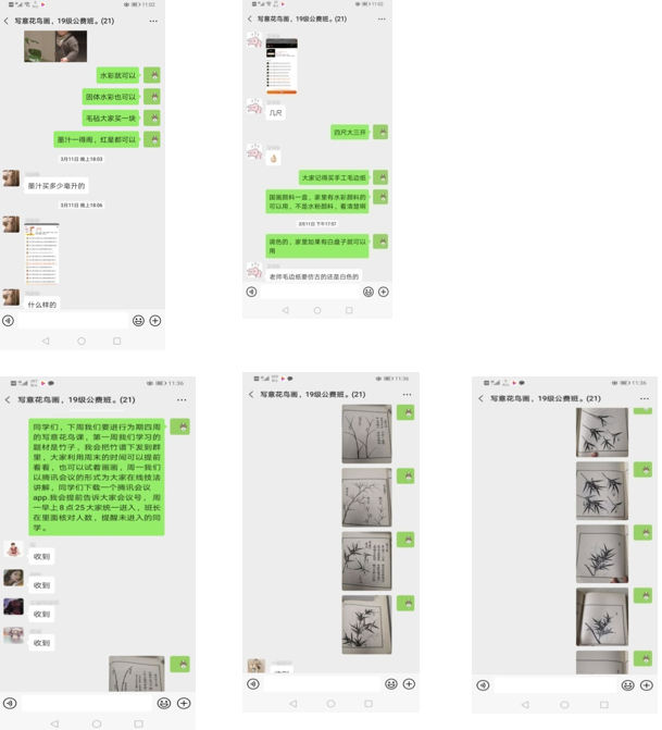 一、对于专业技法课来说,在线授课的难点在于学生的接受程度及学生的回馈反应,我第一周的课是专业技法课—写意花鸟,教授的学生是从未接触过国画的初学者,那么课前的准备工作尤为重要,包括学生在画具上的挑选,在上课的前期就要准备充分,同时准备课前预习,把一些绘画资料提前发到班级学习微信群里,督促同学做好课前准备,保证课程能顺利进行。教师的课前准备也不能有半点马虎,我会提前部署好几周的课程进度计划,每一周都按计划要求进行,准备工作做得充分,后面的教学才会事半功倍。