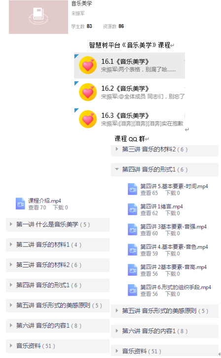 《音乐美学》课程采用智慧树集合QQ群,同时结合腾讯会议的方式开展线上教学。相关课程资源包括:课程视频、课程PPT、音视频资料等。
