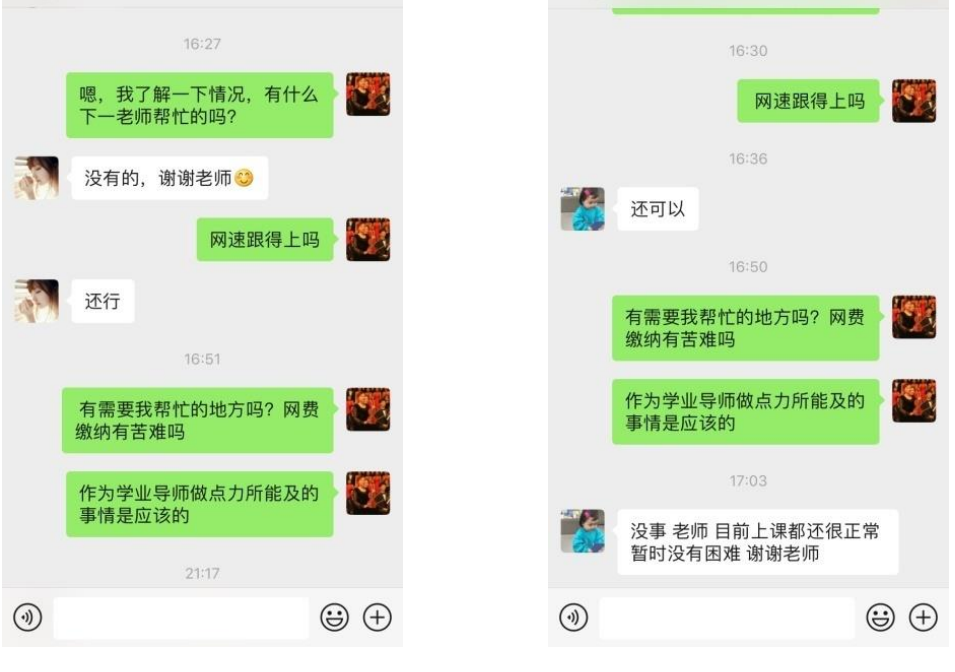 自始至终将学生放在教学工作的第一位,关爱学生的学习及身心发展,在线上教学开展期间,针对课程推进情况,课下主动与学生进行沟通了解学生的学习困难,尤其是对于家庭困难的学生进行私下交流,询问其全面利用网络进行学习的困难,主动要求为其资助。