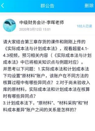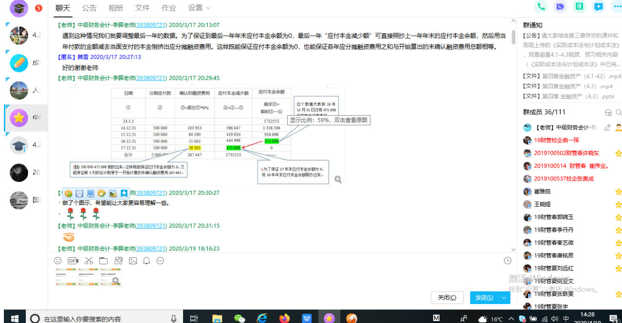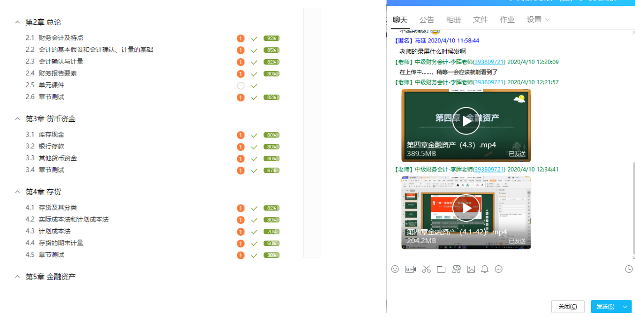 《中级财务会计》课程的教授过程中,我们利用了超星慕课的视频资源与QQ 群直播相结合的方式。在超星平台,我们选择了贵州财经大学《中级财务会计》课程资源,因为该资源所使用的教材体例、课程内容安排与我们的教学安排基本同步,视频资源基本都在 10 分钟左右,能将各章节主要知识点进行提纲挈领地介绍。此外,有些需要进行推导和进一步详细解释的内容,我们通过 QQ 群直播的方式,利用屏幕共享,对 PPT 课件进行演示。在课件制作过程中,对具有逻辑关系的内容均设置相应动画播放,一方面能体现如何进行推导,留给学生思考的时间,调动学生学习兴趣;另一方面能避免一张幻灯片出现即是满屏内容,容易使学生产生视觉疲劳或厌烦情绪。