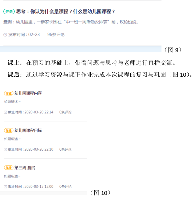 经过几周的探索,《幼儿园课程》逐渐形成了“ 课前 预习 —— 课 上互动 ——课后 巩固”的学习模式,采用“ 共享课+ 录播+ 直播交流+ 课下作业”的形式。