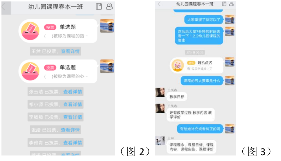 最初采用分知识点让学生观看共享视频,并通过知到 APP 中的群聊功能进行互动,主要包括签到、抢答、投票、随机点名、课堂答疑等功能(图 2、3)。