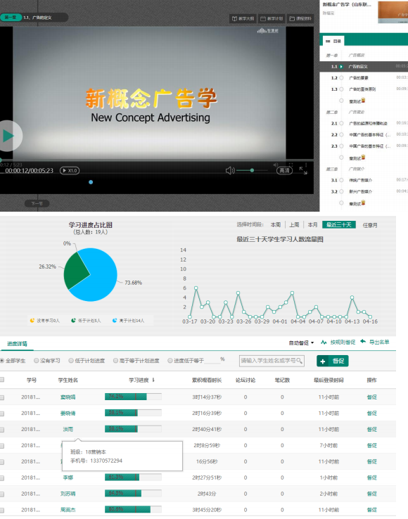 经过筛选,选用了智慧树平台的共享课程:山东联盟的《新概念广告学》,该课程的在线教程和教学资源与我们这门课的课程内容最相近,视频讲解重点突出、逻辑清晰、语速适中,适合学生观看学习。但是,仅仅利用现成的线上课程学习的话,学生自主性较差,学习兴趣不高,注意力不集中,而且教学视频与我们的教学安排不是完全相符,所以,只是把这门共享课作为我们的辅助教学资源,帮助学生进行课前预习、课后巩固以及知识点的延伸跟章节测试。