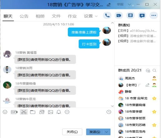 线上教学开始之前,跟学生进行了沟通,学生反映更喜欢直播教学,学习主动性跟兴趣更高,而且该班级学生人数仅有19人,直播教学容易管理,能够保证大部分学生的课堂互动交流与指导。平台选择上,考虑学生对于QQ非常熟悉,也是一直在使用的交流工具,加上腾讯为了迎合疫情期间线上教学增加了很多功能:群课堂、课程回放、学习打卡、作业等功能,能够满足教学需求,所以选择了QQ群作为主要的教学工具,直播方式采用屏幕共享+语音直播讲解课程。