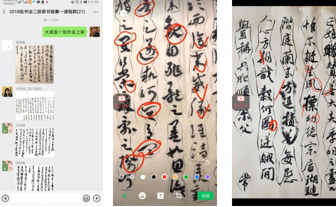 2.课程内容及教学方案方面。本课程本是临摹名家作品,加强对学生的基本功训练,为学生将来的进一步学习打好坚实基础。在上课期间,增加了很多网络资源来丰富教学内容,主要采取让学生按时在微信发作业图片,给学生进行语音和文字点评的方式,及时了解学生作业进度及情况,以便解惑答疑、因材施教。