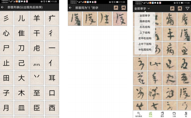 2.借助学习APP进行结构类型和偏旁部首的分类,总结造型规律。结合技法课的特殊性,有现成的软件可以起到良好的辅助效果,结构类型和偏旁部首的自动分类就是非常好用的一项。节省了学生整理的时间,并能很快总结出字帖的造型规律。