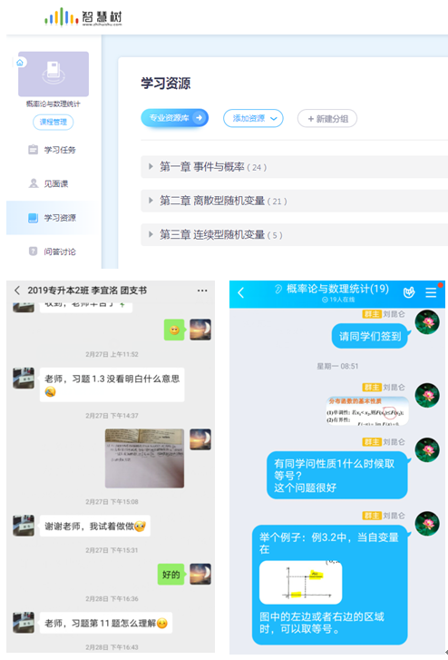《概率论与数理统计》这门课程选用的是智慧树教学平台,学生为2019级数学与应用数学专升本2班,共18人。本周已经是线上教学的第九周了,学生由最开始的不习惯、不适应变为现在的积极参与、主动配合,大部分学生都能自觉的进行网上签到、观看教学视频、问题讨论、完成作业等环节。