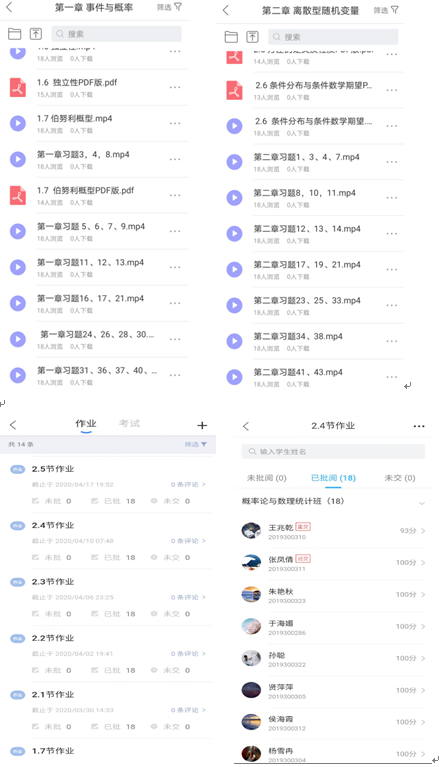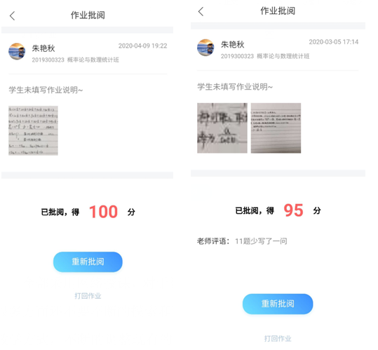 每节课都会布置课后作业,要求学生在一周后提交,每次作业100分,并“允许迟交”,因为有些题目由于基础不好的学生来说是难度的,我允许学生在上完习题课之后再提交。要求学生将作业写在作业本上,拍照上传,这是由于概率统计中用到很多符号和希腊字母,需要学生通过手写练习来不断的巩固,因此我要求所有的作业必须要手写,作业本等开学后还可以再交上来检查。
