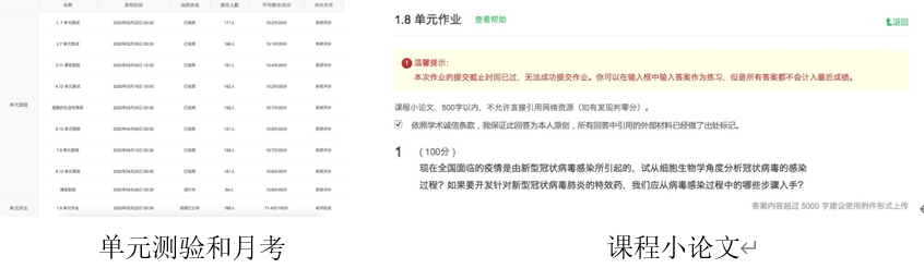 教师设置章节单元测试和月考模块,章节单元测试检测学生对基础知识的掌握;每月(4章节)设立月考一次,考察学生对基础知识的理解和对知识应用的熟练程度。学生在完成自主学习和课上学习之后可以通过中国MOOC考试模块检测学习效果。根据测验结果,教师汇总学生易错的问题并向学生反馈,并在月考中集中体现。同时,为了根据课程内容设立课程小论文,培养学生运用所学知识解释、解决实际问题的应用能力。