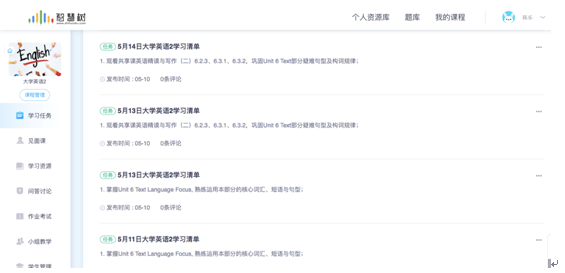 3.课前于智慧树翻转课发布次周每次课的学习清单;