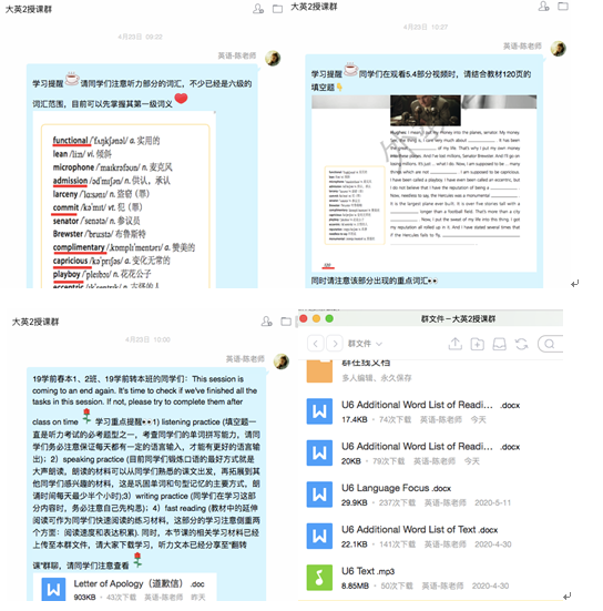 5.在学生自主学习共享课视频时,在授课群中及时发布学习提醒与总结,帮助学生梳理学习重难点内容,同时,于授课群中上传相关学习材料,供学生们下载学习;