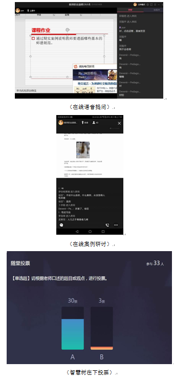 课程模式:在线直播课堂。自主建设《教师职业道德》翻转课,在翻转课内发布学习材料、学习任务、课堂作业。使用智慧树数字教学工具或腾讯课堂开通见面课直播教学通道。课下提供学习资源供学生自主学习。建立QQ组织教学讨论答疑,建立微信群,通过QQ和微信群保持日常教学管理和联系。