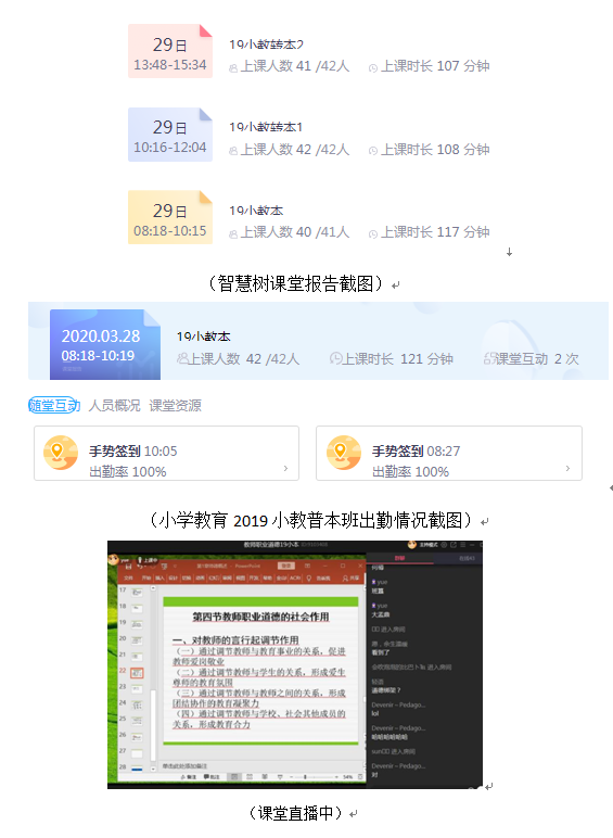 上课情况:《教师职业道德》是单(双)周课程,总课时为18课时,共9次课,目前已经进行到第6次课。第一次上课后就发现智慧树平台直播功能不健全,存在网络拥堵的问题;而腾讯平台网络稳定,无卡顿现象,但腾讯课程系统结构不清晰。最好的方法是处理方法是二者结合使用。从第二次上课开始,使用智慧树平台签到功能、投票、头脑风暴;使用腾讯课堂的进行课堂直播,在教学过程中点名、提问、讨论,交流互动;课堂作业通过智慧树平台提交。