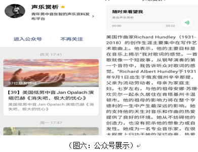 4.在课余我创办了我的微信公众号“声乐赏析”,每天都坚持推送声乐学习资料、视频,截止到目前已经坚持了六年,尤其是疫情期间每天的点击率都很高,在全国声乐界受到广泛关注,开阔学生的视野,提高学生的专业审美能力,翻译大量文献资料,让学生获得更多的曲目知识,不光是为我院的师生提供了帮助,还为兄弟院校的师生和广大的声乐爱好者提供了宝贵的资源。