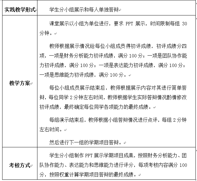 为了满足能力范式要求,实践教学的主要任务是增强学生对理论知识的掌握与应用能力,掌握财务分析技能;提高团队沟通协作能力;完善语言、文字表达能力;最重要的是养成批判性思维能力。为实现以上教学任务,本课程将在实践周安排学生进行学期项目答辩,以考察学生能力的掌握情况。