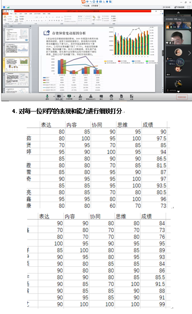 在每一位同学的PPT展示结束之后,教师要进行学期项目在线答辩,学生需对展示过程中的一些疑点进行解释,教师根据答辩过程对财务分析能力、团队协作能力、表达能力和思维能力四项能力的分数进行最终敲定。