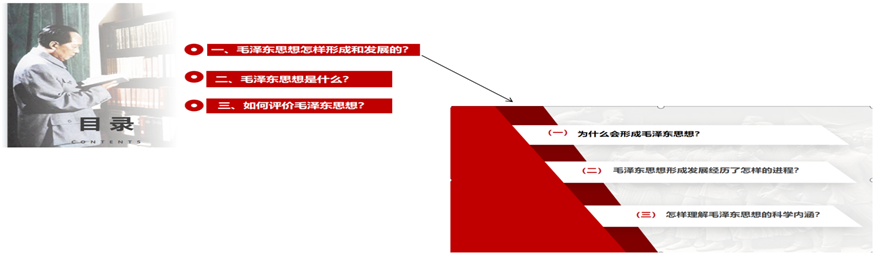 教师在线上教学中相较于课堂教学有不便的地方,但千万不能变成自己的“独舞”,教师要成为学生在线学习的引导者和促进者。“如何引导学生积极有效地参与课堂?如何高效地实现教学目标?”是我在“概论”课课教学实践中一直思考的问题。在“学生中心,问题导向”理念推动下,根据00后大学生思想开放、认知多元和自我意识强的个性特征,结合“概论”课课规律性、理论性和思想性特征,本人以“问题链”设计教学内容,开展线上教学。“问题链”教学能极大地激发学生听课积极性,提高学生专注度,锻炼学生思维能力。“问题链”教学设计中,“问题”是核心,“问题”设计要从教材重难点、教材基本观点、学生思想困惑点、虚无主义挑战点的“结合处”入手,坚持理论逻辑和历史逻辑的辩证统一,以“为什么?是什么?怎么样?”环环相扣、层层递进的“问题链”贯穿教学全过程,最后在师生讨论中,在老师对一个个问题的破解中,使学生真正领略到马克思主义中国化的必要性,中国共产党实事求是的科学性,中国化马克思主义的创造性。下面我以第一章“毛泽东思想及其历史地位”为例展示“问题链”教学设计。如下图,把教材叙述性的语言按照“为什么?是什么?怎么样?”的逻辑进行教学设计,然后再围绕每个问题进行“问题链”设计,环环相扣,通过不断地追问,解决学生内心的困惑,加深对理论的理解。