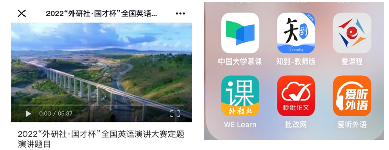 为学生推荐中国大学慕课网和爱课程平台及其他英语学习App,鼓励学生多方面搜集资料,锻炼学生自主学习和合作学习的能力。