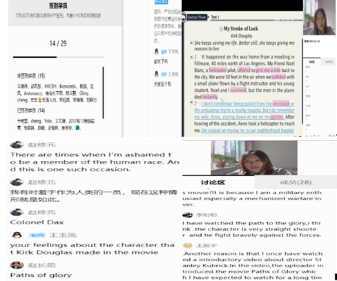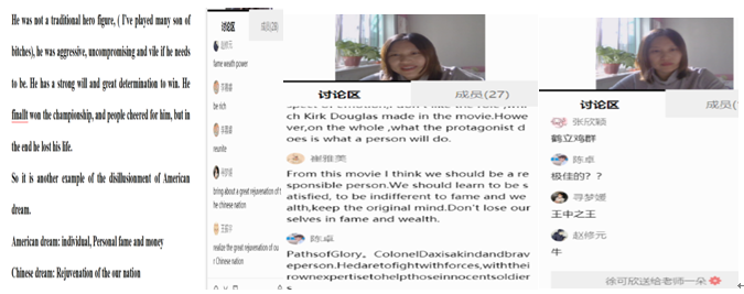 本节课首先检查学生课前作业完成情况,讨论观看电影Champion(夺得锦标归)和电影Paths of Glory (光荣之路)的感受和感想,学生畅所欲言,对主人公追求梦想和正直无私的精神进行探讨,表示要做个正直、有理想的人。教师借机分析了美国梦和中国梦的区别,中国梦是每个中国人为了整个中华民族的复兴而奋斗,国家富强了,人民生活就会富足,有强大的国家,才有我们幸福的小家。