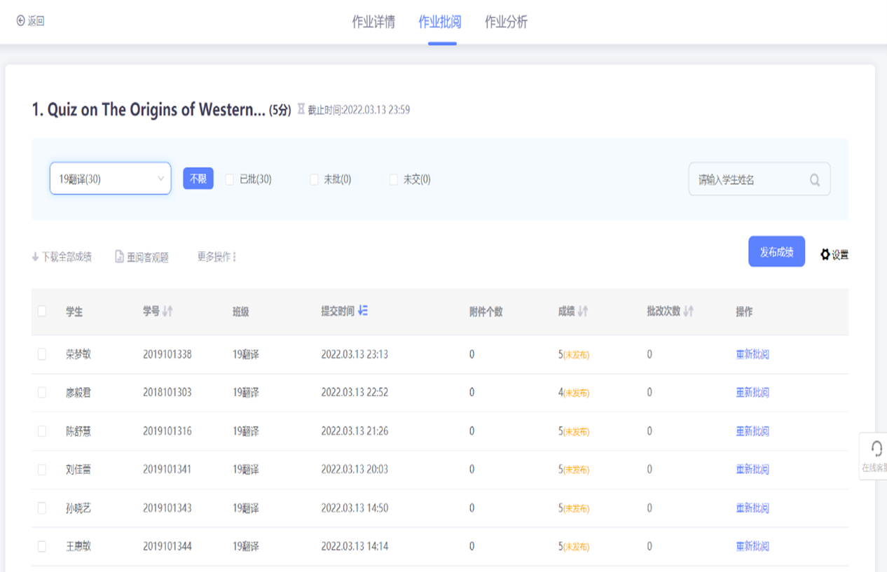 以第一章为例,下图为2019级翻译本科班的测试情况分析: