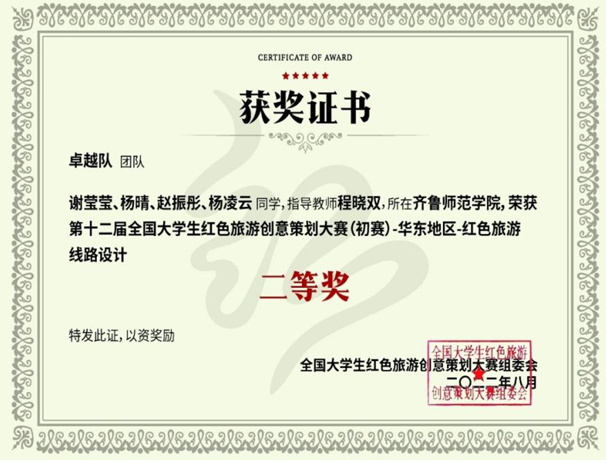 由文化和旅游部、陕西省文化和旅游厅、陕西省教育厅等单位联合主办的“第十二届全国大学生红色旅游创意策划大赛”初赛结果公布,历史文化学院教师程晓双指导的“卓越队”,参赛学生为2020级旅游管理与服务教育专业的谢莹莹、杨晴、赵振彤、杨凌云,获“红色旅游线路设计”类华东地区二等奖。这是历史文化学院连续两年在该项大赛中获奖,作品质量实现了新突破。