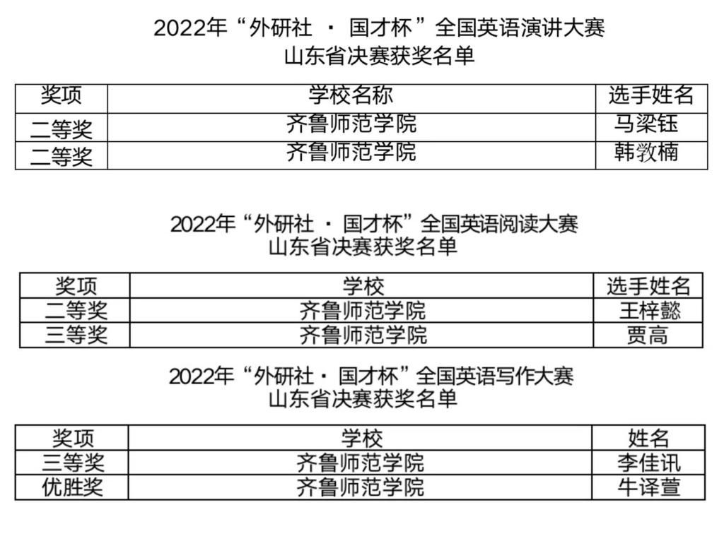 10月30日晚,阅读及写作大赛组委会公布本次比赛获奖名单,叶明晶老师指导的王梓懿同学获阅读赛项山东省二等奖,贾高同学获阅读赛项山东省三等奖。张晨阳老师指导的李佳迅同学获写作赛项山东省三等奖,夏小博老师指导的牛译萱同学获写作赛项山东省优胜奖,11月8日,演讲大赛组委会公布本次比赛获奖名单,刘玮珊老师指导的马梁钰同学获本赛项英语专业选手组二等奖,王昱瑾老师指导的韩敩楠同学获本赛项非英语专业组二等奖。
