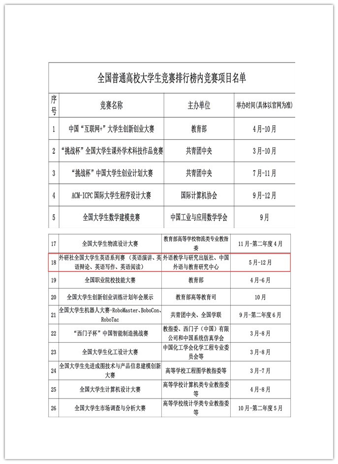 “外研社·国才杯”系列大赛是A类赛事,属于国家级比赛。自创办以来,已成为全国参赛人数最多、规模最大、水平最高的英语类赛事之一。自2017年12月中国高等教育学会发布第一轮全国普通高校大学生竞赛排行榜以来,“外研社·国才杯”演讲大赛连续五年荣耀登榜,是入榜大赛中唯一一项外语类赛事。大赛以赛促学、以赛促教、以赛育人、赛学相长的深刻内涵持续获得学界认可。