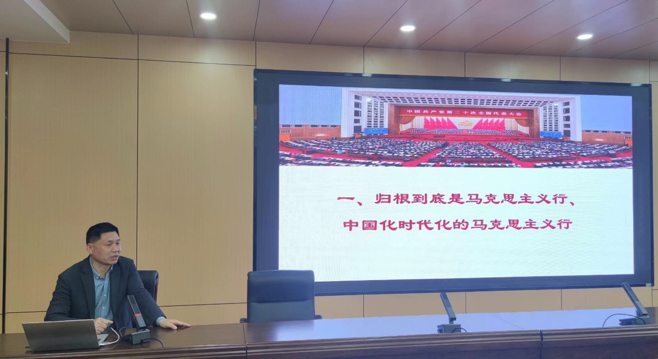 戚桂峰围绕“归根到底是两个行’”“国内外形势新变化和实践新要求”“坚持‘两个结合’的根本途径”“习近平新时代中国特色社会主义思想的主要内容”“开辟马克思主义中国化时代化新境界”五个方面深入浅出地进行了讲解。他以纵贯古今的大历史观透彻分析了马克思主义中国化的历史脉络、演进轨迹,以中西对比的方法清晰揭示了习近平新时代中国特色社会主义思想是顺应“国内外形势新变化和实践新要求”的理论结晶,以详细的数据、生动的视频深刻阐释了“两个结合”的对象、方法、意义、成效等重大理论问题,展现了古今贯通、中西贯通、政学贯通、事理贯通的鲜明特色。他强调,要从习近平总书记的思考和探索中感悟思想伟力、汲取真理力量,不断增进对习近平新时代中国特色社会主义思想的政治认同、思想认同、理论认同、情感认同,做到至信而深厚、融通而致用、执着而笃行。