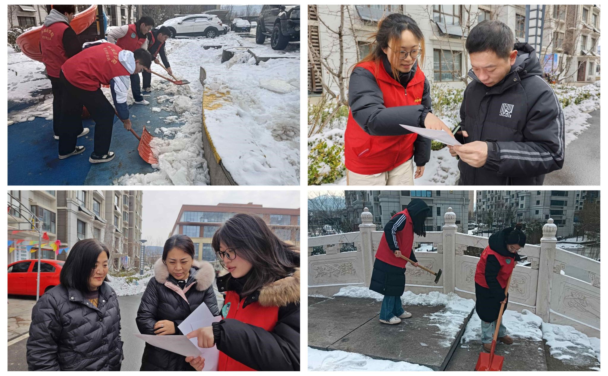 活动当日,12名由学生党员和入党积极分子组成的志愿服务团队分组同步开展了一系列丰富多彩的学雷锋活动。英语推广组别出心裁,设计了“生活场景英语微课堂”,针对社区居民日常需求,制作了涵盖交通标识、公共设施用语、超市用语等实用内容的双语宣传资料。志愿者们采用情景模拟、互动问答等教学方式,现场演示了“Push/Pull”标识、“No Parking”警示等实用场景,帮助居民轻松跨越语言障碍。劳动实践组手持清雪工具,对社区主干道、儿童活动区等重点区域进行全面而细致的清扫。他们分工明确,清扫积雪,为居民的安全出行提供了有力保障。