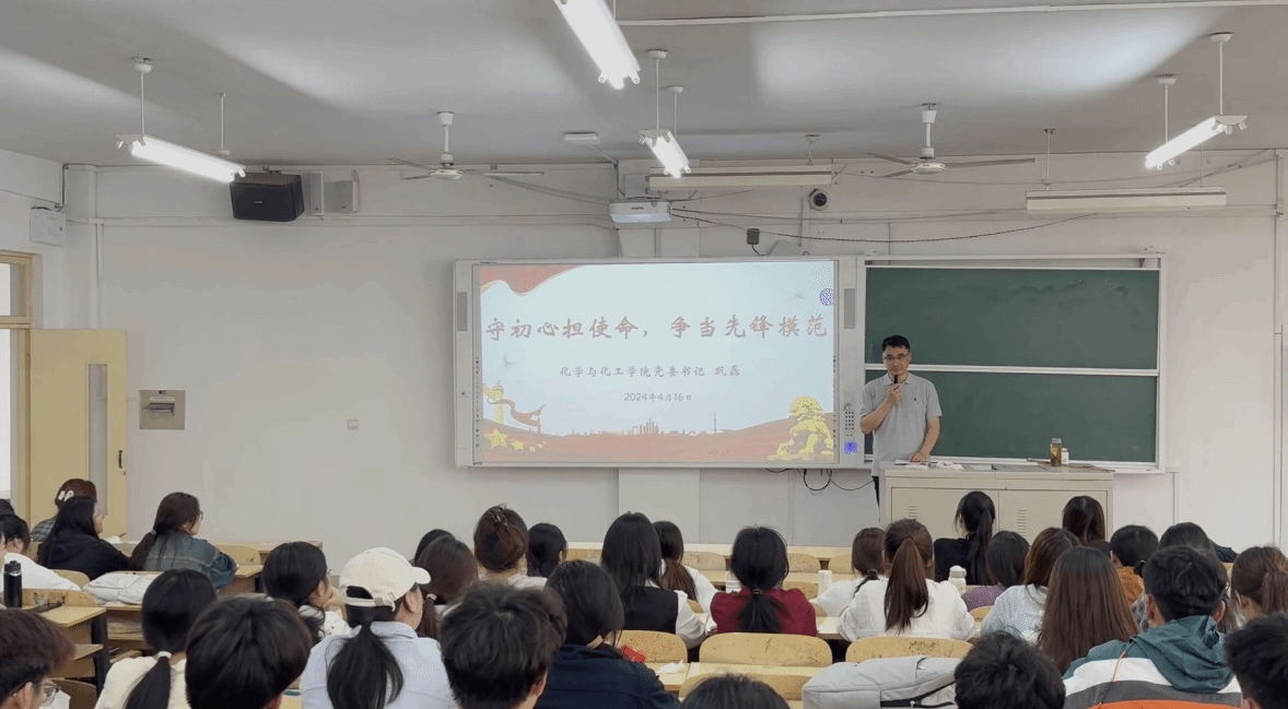 为教育培养入党积极分子端正入党动机、锤炼党性修养、发挥模范作用,4月16日中午,化学与化工学院党委书记巩磊以“守初心担使命,争当先锋模范”为主题,为学院2025年上半年入党积极分子培训班学员讲党课,回溯党的百年奋斗历程,从中国共产党人的精神谱系中汲取不断前进的智慧和力量。